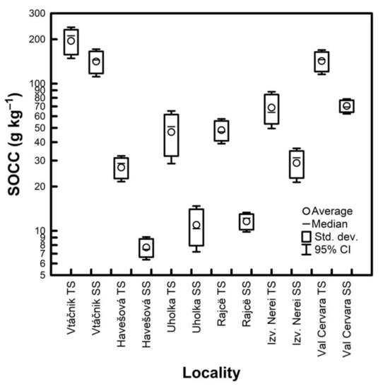 In all but one locality, their average SOCC values were similar or slightly to moderately higher than in other old-growth or managed European beech stands and from colline to mountain sites when compared to the same depth [64,65,66,67,68]. In Havešová, the average SOCC value was exceptionally low, only 12.53 g kg−1, despite high FSV.