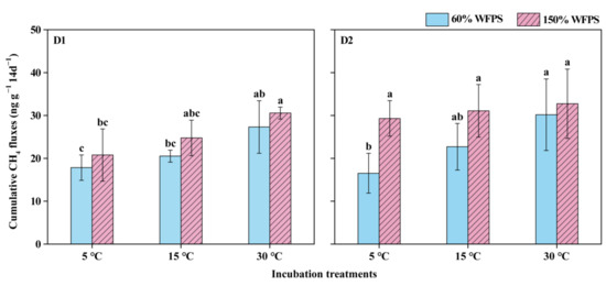 Soil cumulative CH4 fluxes (ng g−1 14d−1) during a 2-week incubation period. The left and right figures show cumulative CH4 fluxes for the different incubation treatments comprising three temperatures (5, 15, and 30 °C) and two soil moisture states (60% and 150% WFPS) for two soil depths (D1: surface soil from 0–20 cm and D2: subsurface soil from 20–50 cm). Different lowercase letters indicate significant differences between treatments (p < 0.05). WFPS: water-filled pore space.