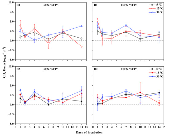 CH4 fluxes (ng g−1 d−1) of the different treatment samples during the incubation period. Positive values indicate CH4 emission, and negative values indicate CH4 uptake. The incubation treatments comprised of combinations of three temperatures (5, 15, and 30 °C) and two soil moisture states (60% and 150% WFPS) applied to soils from two depths (D1: surface soil from 0–20 cm and D2: subsurface soil from 20–50 cm). WFPS: water-filled pore space.