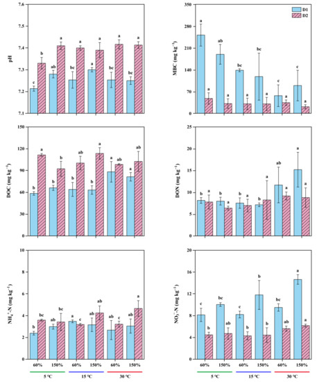 Chemical properties of soil samples after incubation at temperatures of 5, 15, and 30 °C in combination with soil moisture states of 60% and 150% water-filled pore space. The blue and pink bars represent the chemical properties of D1 (surface soil: 0–20 cm) and D2 (subsurface soil: 20–50 cm), respectively. Different lowercase letters indicate significant differences between treatments in each soil layer (p < 0.05). MBC: microbial biomass carbon; DOC: dissolved organic carbon; DON: dissolved organic nitrogen; NH4+-N: ammonium nitrogen; NO3−-N: nitrate nitrogen.