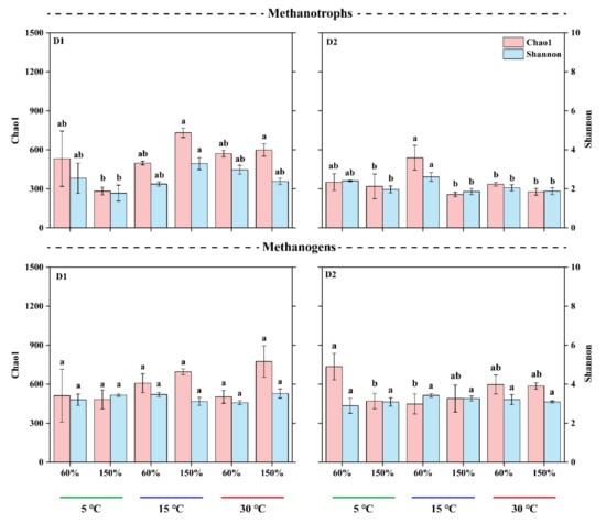 Community abundance (Chao1) and diversity (Shannon) of methanotrophs (upper figures) and methanogens (lower figures) in soil samples after incubation at temperatures of 5, 15, and 30 °C in combination with soil moisture states of 60% and 150% water-filled pore space. Samples from two soil depths were incubated: D1 (0–20 cm) and D2 (20–50 cm). Different lowercase letters indicate significant differences between treatments (p < 0.05).