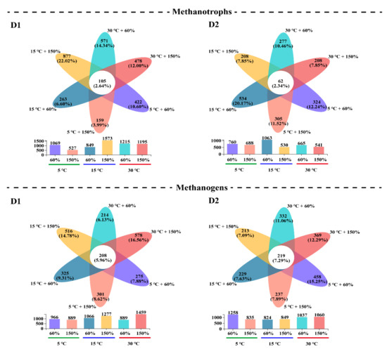 Species composition of methanotrophs (upper figures) and methanogens (lower figures) in soil samples after incubation at temperatures of 5, 15, and 30 °C in combination with soil moisture states of 60% and 150% water-filled pore space. Samples from two soil depths were incubated: D1 (0–20 cm) and D2 (20–50 cm). The core indicates the number of shared species (OTUs). The petals indicate the number of unique species (OTUs). The bar charts show the total species number for each treatment. OTU: operational taxonomic unit.