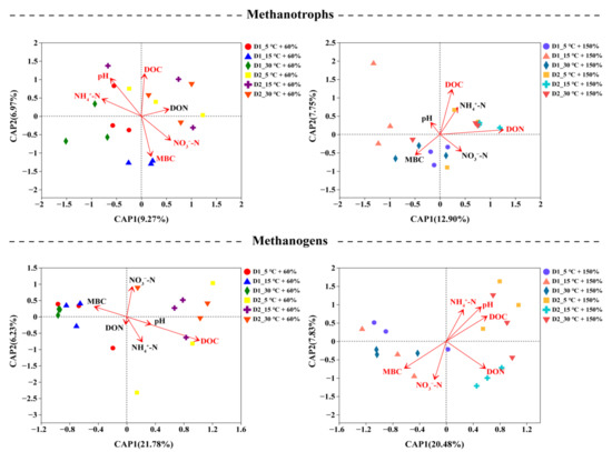 Distance-based redundancy analysis (db-RDA) of relationship between soil properties and methanotrophs (upper figures) and methanogens (lower figures) community composition. Samples from two soil depths: D1 (0–20 cm) and D2 (20–50 cm) were incubated at temperatures of 5, 15, and 30 °C in combination with soil moisture states of 60% and 150% water-filled pore space. Red arrows indicate soil properties, and arrow lengths represent the degree of correlation of soil properties on microbial community composition. The angle of the arrows represents the direction of correlation (acute angles: positive correlation; obtuse angles: negative correlation). Red font indicates a significant effect of soil chemical properties on microbial communities. MBC: microbial biomass carbon; DOC: dissolved organic carbon; DON: dissolved organic nitrogen; NH4+-N: ammonium nitrogen; NO3−-N: nitrate nitrogen.