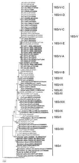 Phylogenetic dendrogram generated by using the neighbor-joining method software MEGA, version X [] with 16S rDNA sequences from phytoplasmas detected in naturally infected elm, alder, ash, conifer, sandal and eucalyptus trees (in bold type), and a number of reference phytoplasmas. Acholeplasma laidlawii was used as the outgroup. Bar represents a phylogenetic distance of 2%. GenBank accession number is given for each phytoplasma. Bootstrap values are shown on branches of the dendrogram.