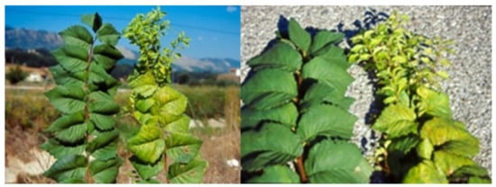 Small leaves, yellowing, and witches’ broom on European field elm (Ulmus minor) shoot affected by elm yellows disease. Left, healthy shoot.