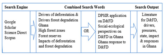 The study was conducted using a literature search in several web-based databases and sources. Key of the web-based databases include Google Scholar, Science Direct, and Scopus. Broadly, the search focused on deforestation and forest degradation in Ghana. The key terms used were “Forest” OR “Deforestation” OR Forest degradation” OR “Social-ecological” OR “DPSIR” OR “Ghana”. The search string was broadened to include an extensive array of key studies on deforestation and forest degradation in Ghana, focusing mostly on social-ecological drivers, pressures, state, impact, and responses of D&FD in Ghana. Figure 2 below depicts the search processes using the key terms as indicated above to show which search engines were used, results obtained and the final output on the key driving factors of deforestation and forest degradation in Ghana. Furthermore, forest policy documents, documentary reviews on deforestation, and forest degradation from book chapters, and Ghana Forestry Commission published and unpublished articles as well as technical reports were reviewed for the study. Additionally, the search string was widened to aid a comprehensive understanding of the dynamics and contours of D&FD in the Ghanaian context.