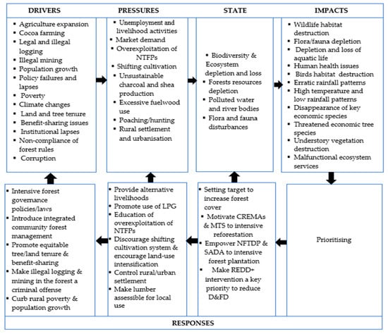 Ghana’s tropical forest continues to face dangers and severe threats of deforestation and degradation. Ghana is currently experiencing alarming deforestation and forest degradation with an annual rate of 2% (about 135,000 hectares/year) of forest cover loss through anthropogenic causes [34]. There is the need to tackle the underlying factors that drive direct causes of Ghana’s D&FD. Therefore, this review aims to analyse the causes of D&FD in Ghana through a social-ecological perspective to understand how drivers-pressure-state-impact-response (DPSIR) reinforces D&FD. There is a paucity in the DPSIR literature regarding the causes of D&FD in Ghana. This necessitated our aim to use the DPSIR to present to forest policy and management planners to understand the chain of causal links in D&FD, as the use of DPSIR to analyse D&FD from the social-ecological lens is underexplored.