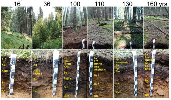 The progression of the ecosystem from open gaps towards a mature forest with a closed canopy was also apparent in spodic horizons, but its manifestation was delayed by ca. 100 years compared to the topsoil. During that time, however, the E and Bhs horizons, which were absent in the 16–110-year sites, developed (see Figure 1). Their formation was surprisingly fast if we consider that the establishment of Albic Podzols with a typical sequence of horizons A-E-Bhs-Bs-BC-C usually takes millennia [113,114]. Such a rapid development points rather to a re-establishment of the horizons instead of their completely new formation, which could be an attached process accompanying the natural life cycle of the spruce forest (from the old-growth forest through open gaps and their succession back to the mature forest, driven by occasional disturbances). The Albic Podzol is a soil type characteristic of natural old-grown spruce forests (see also Figure 1). We speculate that a canopy opening and post-disturbance development of grassy vegetation (together with related changes in the microbiome and mediated soil processes) probably caused a deepening of A horizon, which covered and overgrew the original E and Bhs horizons. It resulted in the formation of the soil type classified as Entic Podzol. Subsequent gradual canopy closing led to a retreat of grasses, immobilization of available nutrients in growing woody vegetation, a change in the litter character and soil acidification, conditions supporting the rapid re-establishment of Albic Podzols. There are a few other reports on regressive Podzol development in the literature. Šamonil et al. [17] described the development of Albic Podzols from Entic Podzols, occurring in the order of hundreds of years instead of millennia, after soil mixing by tree uprooting. Regressive Podzol development due to the expansion of the grassland community without mechanical soil disturbance was described after the anthropogenic impact by Barret and Schaetzl [16]. However, as far as we know, such Podzol regression associated with potential soil rejuvenation has never been described as a component of a natural cycle of the terrestrial ecosystem. To increase our understanding of the relationship between forest dynamics and soil genesis, the transition from a mature closed forest to gaps, the event in forest dynamics that is crucial for the possible soil rejuvenation, requires further research.