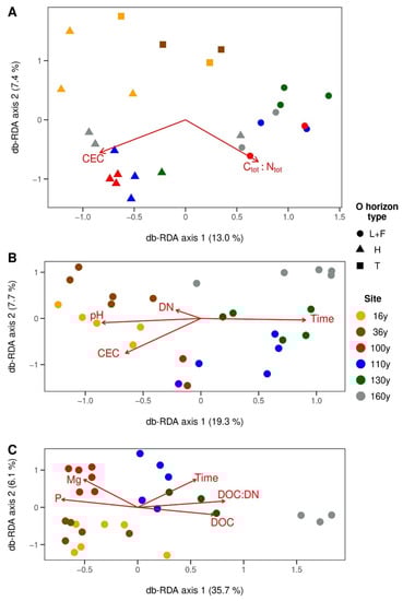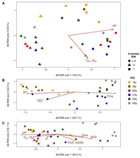 Bacteria were the most influenced by pH and by Ctot:Ntot in O horizons. The position on the x axis separated samples according to pH, where the communities of L + F and T types were agglomerated at high-to-intermediate pH levels, while H-type horizons were located at the lowest end of the pH gradient in the db-RDA ordination plot (Figure 3A). The differences between O-horizon-type-associated bacterial communities further stemmed from differences in Ctot:Ntot. The youngest 16- and 36-year sites with T-type horizons with the lowest Ctot:Ntot were divided from the mature forest stands laying along the Ctot:Ntot continuum. The canonical correspondence analysis (CCA) plot suggests that the more acidic conditions in H-type horizons were preferred by Acidobacteriae and Planctomycetes, while OTUs belonging to Bacteroidia and Gammaproteobacteria were inclined to favour a higher pH (Figure S2A). The most abundant OTUs were clustered closer to L + F- and H-type organic horizons, which implies the preference of these bacteria that occur in high relative abundance across all sites for organic material with a higher C:N ratio.