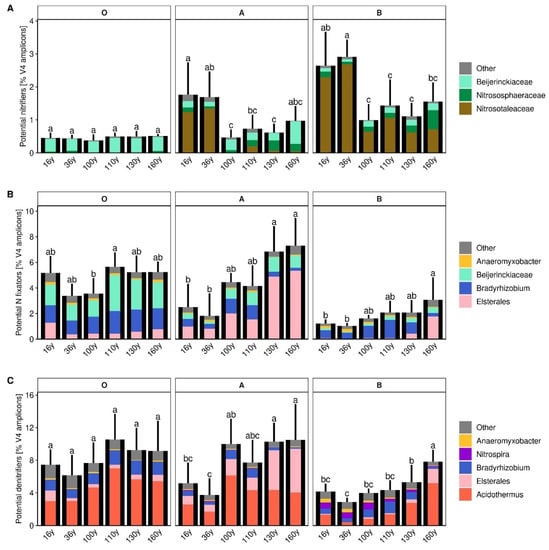 Relative abundance of microbes potentially capable of (A) nitrification, (B) N fixation and (C) denitrification in the respective sites and horizons. The outer black columns and error bars represent the mean and SD of all selected OTUs, respectively. Small letters denote differences significant at p < 0.05 between the summed relative abundance of the respective groups. The coloured inner columns show the taxonomic classification of included OTUs.