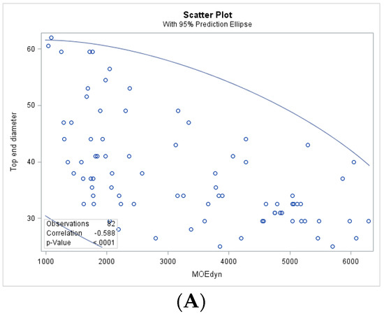 The correlation analysis between the top-end diameter (Dtop–end, cm) and the dynamic modulus of elasticity (MOEdyn, N mm−2) of the small-leaved lime trees showed moderate negative correlation (r = 0.495) (Figure 6). Overall, the increase in Dtop–end resulted in the decrease of MOEdyn.