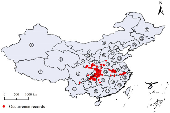 The current occurrence records of C. japonicum used in the study were collected from the Global Biodiversity Information Facility (https://www.gbif.org (accessed on 31 August 2020)), the Chinese Virtual Herbarium (http://www.cvh.org.cn (accessed on 31 August 2020)), the Specimen Resources Sharing Platform for Education (http://mnh.scu.edu.cn (accessed on 31 August 2020)), the Chinese Field Herbarium (http://www.cfh.ac.cn (accessed on 31 August 2020)), and from published literature [24]. Google Earth (http://ditu.google.cn (accessed on 31 August 2020)) was used to assign longitude and latitude data to any record that lacked geographic coordinates. To match the resolution of the selected environmental variables and avoid overrepresentation of environmental conditions in densely sampled areas, only one distribution record was kept in each 2.5 × 2.5 arc-minute grid cell. In total, 190 occurrence records of C. japonicum were retrieved, of which 163 records were included in this study (Figure 1).