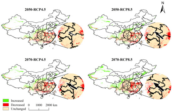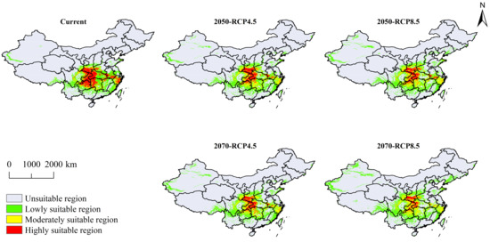 Under RCP8.5, the ensemble model estimated that the range of suitable habitat would increase in southwestern Xinjiang, eastern Xizang, southern Gansu, central Sichuan, central Shaanxi, and southern Shanxi by a total of 3.74 × 105 km2 by 2050. The area of lost suitable habitat of ca. 2.78 × 105 km2 was mainly scattered in southern Henan, central Hubei, northern Hunan, northern Anhui, central Jiangsu, and northern Jiangxi. By 2070, suitable habitats will increase relative to the amount in 2050 in southeastern Liaoning, and other areas will remain basically unchanged. The suitable region that experienced an increase was equal to 5.80 × 105 km2, while the suitable region that experienced a loss was equal to approximately 3.84 × 105 km2 (Figure 3, Table 5). When compared with the current conditions, the total suitable regions under the RCP8.5 climate scenario will increase by 8.83% in 2050 and 14.72% in 2070, while the highly suitable regions will decrease by 49.98% and 72.24%, respectively (Table 4). The highly suitable regions in Hunan, Guizhou, Anhui, Zhejiang were almost completely lost by 2070 (Figure 2).