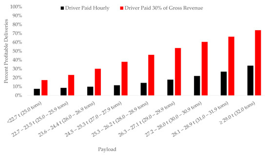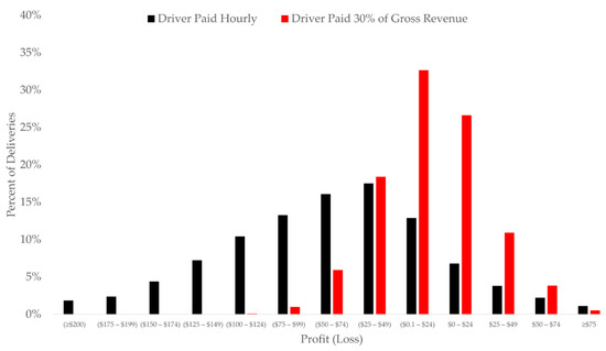 When the driver was paid 30% of the gross revenue generated by the truck, 58% of deliveries were unprofitable (Figure 1). The average estimated loss was $5.37 and net revenue ranged from a loss of $149.97 to a profit of $166.90 (Table 1). Drivers compensated 30% of gross truck revenue received the equivalent of $17.17 per hour on average (median = $16.35 h−1).