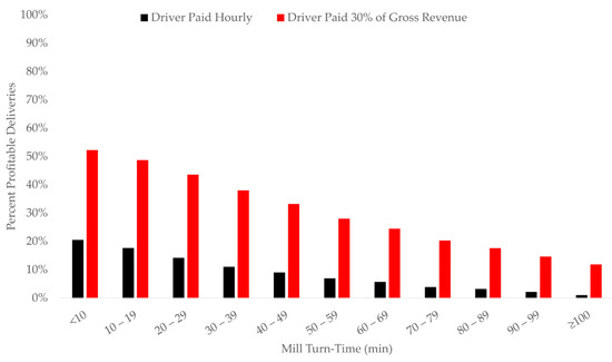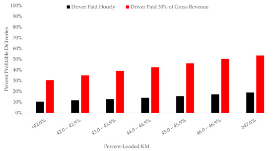 One of the reasons that it is difficult for log truck owners to pay competitive wages is that fewer than half of all log truck km generate revenue [11,27]. Increasing percent-loaded km, even by small amounts, can increase the profitability of timber transportation (Figure 7). In other trucking industries, it is common for fleets to achieve better than 80% loaded km [32]. Log trucks will never achieve 80% loaded km because of the need for unloaded log trailers to arrive at harvest sites and loaded ones to be delivered to mills. Log trailers are generally designed for a single product, which limits their ability to pick up backhauls. Nonetheless, previous research demonstrates that by sharing truck resources between multiple logging crews and centrally dispatching log trucks, log truck fleets can increase percent-loaded km to above 50% and haul more timber with the same number of trucks [25,26,48]. Only 25%–30% of log trucks’ time is spent traveling loaded (Table 1) [13,49]. Clearly, there are opportunities to increase the percentage of time and km that generate revenue.