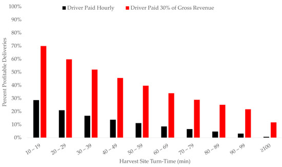 The percentage of profitable deliveries declined linearly with mill turn-time (Figure 4). When the driver was paid 30% of gross revenue, 52% of timber deliveries were profitable when mill turn-time was under 10 min. In contrast, fewer than 25% of timber deliveries were profitable when mill turn-time was one hour or longer. The same trend was observed with turn-times at harvest sites (Figure 5). More than half of timber deliveries were profitable when harvest site turn-time was under 40 min and the driver was paid 30% of gross revenue. When harvest site turn-time exceeded one hour, fewer than 35% of timber deliveries were profitable. Log trucks spent an average of just 27% of their time traveling loaded (Table 1).