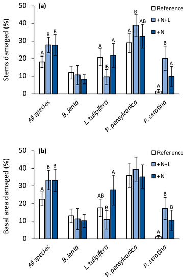Tree damage from a windstorm across the reference, nitrogen fertilized (+N), and nitrogen and lime fertilized (+N+L) treatment areas in the Long-Term Soil Productivity Experiment (LTSP) Experiment: (a) Percentage of total basal area damaged across all tree species and within the four dominant tree species; (b) Percentage of total stems damaged across all tree species and within the four dominant tree species. Bars and error bars represent the empirical means and one standard error, respectively. Differences in capital letters within a species group denote significant differences (p < 0.05) between treatments, determined by bootstrap hypothesis tests.