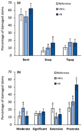 Stem damage from a windstorm across the reference, nitrogen fertilized (+N), and nitrogen and lime fertilized (+N+L) treatments in the LTSP Experiment: (a) Percentage of tree stems damaged by damage type; (b) Percentage of tree stems damaged by damage severity. Bars and error bars represent the empirical means and one standard error, respectively. Differences in capital letters within either a type or severity group denote significant differences (p < 0.05) between treatments, determined by bootstrap hypothesis tests.