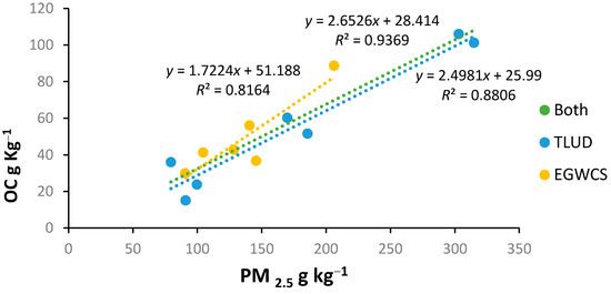 The organic carbon (OC) and particulate material (PM2.5) emitted were compared. The aim was to assess the performance of this lower cost method [43]. Organic carbon (OC) of dry fuel consumed showed a positive correlation with the amount of emitted particulate material (PM2.5) in both gasifiers (Figure 1). The best correlation (R2 = 0.93 and p < 0.05) was observed when using the T-LUD gasifier, while the use of the EGWCS gasifier presented a weaker positive relationship (R2 = 0.81 and p < 0.05). Regarding to total OC and PM2.5 emissions, we observed that the lower the formation of organic matter (organic carbon), the lower the emissions of PM2.5. The results in Figure 1 show a clearly low dispersion of the data points, indicating a high accuracy in the estimation of OC using PM2.5. Similar to previous studies, de la Sota et al. [43] showed a correlation between black carbon and elemental carbon (R2 = 0.84). On other hand, Thompson et al. [52] showed a significant correlation between composition (OM + EC) and PM2.5 (R2 = 0.94), and no correlation between composition EC/total carbon (TC) and PM2.5 emission factors (R2 = 0.07).