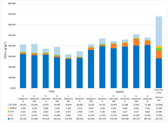 Figure 2 shows the impact on average global warming or radioactive forcing of pollutants from incomplete combustion. The emission of CO2e was higher for pellets produced from A. xalapensis (with bark and without bark) burned in the gasifier T-LUD, while J. deppeana with bark showed the lowest production of grams of CO2e. On the other hand, the EGWCS gasifier had the highest contribution of CO2e. Concerning the T-LUD gasifier, A. xalapensis with bark and without bark presented the highest emission, followed by Q. sideroxyla. J. deppeana with bark emitted 412.56 g CO2e kg−1, which showed the lowest contribution for this gasifier.