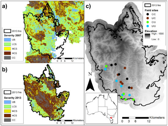Severity maps for the (a) 2007 Great Divide wildfire and (b) 2013 Aberfeldy wildfire. Panel (c) shows the location of the study area (red square in the inset) and the field sites used to assess the effect of the fire combinations on fuel properties. The footprint of the 2013 Aberfeldy wildfire has been included in each panel to provide a reference. The fire severity classes presented in panels (a,b) are unburnt (UB), low canopy scorch (LCS), moderate canopy scorch (MCS), high canopy scorch (HCS) and canopy consumption (CC). Descriptions of these severity classes are provided in Section 2.2. The fire severity combinations presented in panel (c), which describe the severity of the 2007 and 2013 fires, are understorey fire followed by an understorey fire (U/U), canopy fire then an understorey fire (C/U), understorey fire then a canopy fire (U/C) and canopy fire then a canopy fire (C/C). Descriptions of these severity combinations are provided in Section 2.4.