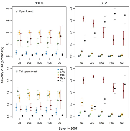 The effect of the severity of the 2007 fire (x-axis) on the probability of each severity class occurring during the 2013 fire (y-axis) for (a) open forest and (b) tall open forest types under nonsevere (NSEV) and severe (SEV) fire weather. Points show the mean and error bars are the 95% credible intervals. The fire severity codes are unburnt (UB), low canopy scorch (LCS), moderate canopy scorch (MCS), high canopy scorch (HCS) and canopy consumption (CC). Slope, aspect, topographic position (TPI), latitude and longitude have been held constant at their mean values.