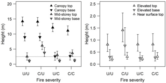Model predictions for the plant crown top and base heights across the four fuel strata. The left panel shows the canopy and mid-storey layers. The right panel shows the elevated and near-surface layers. Upward-facing triangles represent the average crown top height and downward-facing triangles represent the average crown base height. Error bars show the 95% confidence intervals. The broken line in the left panel corresponds to the maximum height (2.5 m) in the right panel. The fire severity combinations are understorey fire followed by an understorey fire (U/U), canopy fire then an understorey fire (C/U), understorey fire then a canopy fire (U/C) and canopy fire then a canopy fire (C/C).