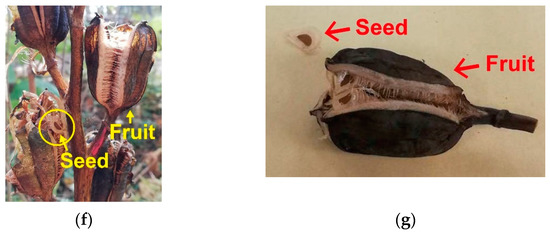 Flowers of Cardiocrinum cordatum (Thunb.) Makino. (a) An inflorescence; (b) pollinator exclusion experiment using polyester bags; (c) a bumblebee (Bombus diversus tersatus); (d) a marmalade hoverfly (Episyrphus balteatus); (e) leaf beetles (Chrysomelidae sp.); (f,g) fruits and seeds. Photographs were taken at Hokkaido Obihiro Agricultural High School (a–e) in July and (f,g) in October, in 2020, by (a–d) Kohei Koyama and (e–g) Riko Komamura. The original high-resolution images are available as Supplementary Materials.