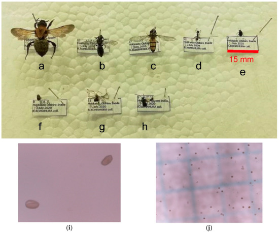 Different species visiting the flowers of Cardiocrinum cordatum (Thunb.) Makino. (a) A bumblebee (Bombus diversus tersatus), (b) a sweat bee (Halictidae sp.), (c) a marmalade hoverfly (Episyrphus balteatus), (d) an ant (Myrmica ruginodis (s.l.)), (e) a leaf beetle (Chrysomelidae sp.), (f) a sap beetle (Nitidulidae sp.), (g) a spider (Araneae sp.), and (h) an earwig (Dermaptera sp.). (i,j) Pollen grains of C. cordatum were observed during the counting. The photographs were taken by Riko Komamura in 2020. The original high-resolution images are available as Supplementary Materials.
