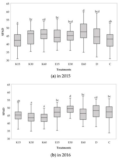 This trend is no longer observed in 2017 (Figure 1c). Compared to control SPAD values, samples irrigated with surface water show a lower rate. In this case, the K30 plants had the lowest chlorophyll means (43.5), while the E30 treatment had the highest value (49.0).