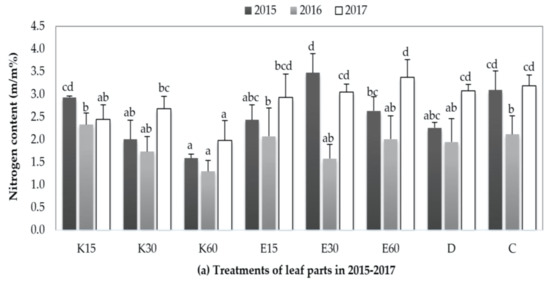 Nitrogen content values of leaf and stem parts from 2015 to 2017: (a) nitrogen content values of leaf parts in a year of 2015–2017; (b) nitrogen content values of stem parts in a year of 2015–17. Average nitrogen content data are presented from eight treatments. Results are means ± SD, n = 6. Treatments were compared annually. Different letters introduce significant differences among irrigation water qualities for the three vegetation season, confirming to the Tukey’s test at p ≤ 0.05.
