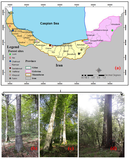 Overview of the forest sites in northern Iran and approximate location of them used in this analysis (a); Alnus subcordata, one of the main tree species on the forest site of the Nav (b); Fagus orientalis, the main tree species on the forest site of the Kheyroud forest (c); Quercus castaneifolia, one of the main tree species on the forest site of the Loveh (d).