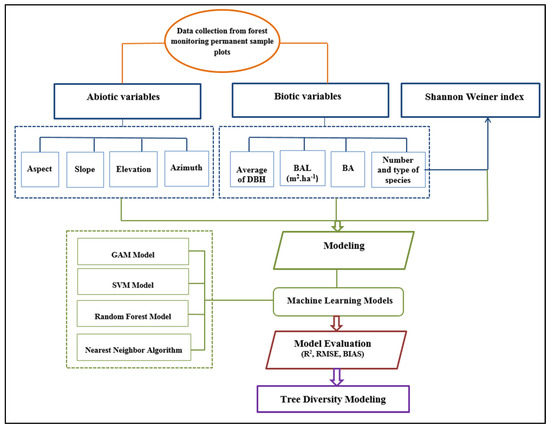 In recent years, machine learning (ML) methods have been widely used to investigate the effect of changes in environmental conditions on biodiversity. ML is one of the most important branches of artificial intelligence, which is widely used for analyzing forest data due to its significant advantages in some circumstances. ML processes often include the following: (i) Data selection and preprocessing. (ii) algorithm selection and (iii) assessment of solutions [24,25]. The application of machine learning has been used to improve local, regional, and global estimates in complex ecosystems such as forests [26]. ML methods have also been used in forest management and hazard assessment [27,28].
