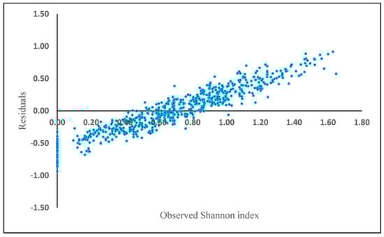 where H is the Shannon diversity index, BA is the basal area (m2 ha−1) and Elevation is height above sea level (m). The rest of the biometric and physiographic parameters were not significant in the equation. BA (t = 2.51, p = 0.02) and elevation (t = −0.05, p = 0.00) were statistically significant, resulting in an R2 of 0.17, a RMSE of 0.47 and mean residual deviation (Bias) of 0.87. The relative RMSE was 70.14%. The residuals showed a positive bias in plots where Shannon index exceeded 0.8 (Figure 4).