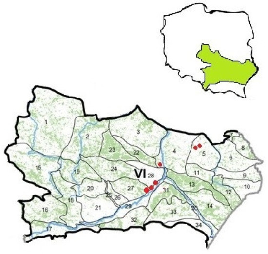 Location of the Małopolska Kraina (VI) on the territory of Poland with marked mesoregions (Arabic numerals) and research stands (red dots). Important markings mesoregion: 4—West-Lublin Upland, 5—East-Lublin Upland, 27—Chmielnicko-Staszowski, 28—Opatowski, 29—Vistula Lowland. Prepared on the basis of [44].