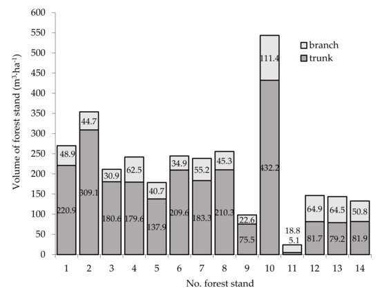 The volume of forest stands (main and secondary stands together), including the volume of trunks and branches, as shown in Figure 2—Full numerical data with the breakdown of the volume of trunks and branches (in m3 ha−1) into thickness classes are given in Table A1 (Appendix).