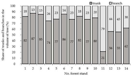 The shares of branches and trunks in the volume of stands in the bark, expressed as a percentage, are presented in Figure 3.