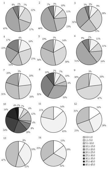Share of thickness classes in the volume of forest stands (numbers from 1-14 correspond to the numbering of forest stands).