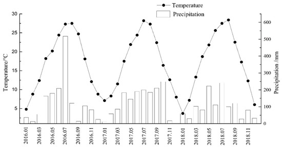 Monthly temperature and precipitation during 2016–2018 in Zigui County.