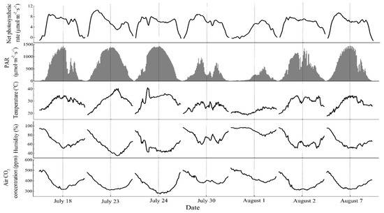 Photosynthesis is the primary process by which plants use light energy to drive the synthesis of organic compounds and it is pivotal for plant growth and productivity [1]. Regardless of ontogeny, the photosynthesis rate is highly dependent on environmental factors, such as stomatal behaviors, molecular machinery of the chloroplasts, and morphology, which are sensitive to environmental variations [2,3]. The diurnal variations in photosynthesis generally reflect the responses of a plant to environmental factors [4,5]. While, there are often transient changes in environmental factors in the natural environment, but there are few studies on the responses of the photosynthetic rate to these transient changes. The diurnal variations in photosynthesis were monitored in previous investigations by fitting the measured values at intervals of 1–2 h [6,7], but they were unable to accurately understand the effects of the transient environmental changes on the photosynthetic rate. However, the diurnal variations of photosynthetically active radiation (PAR), temperature, humidity, and CO2 concentrations varied with weather conditions, and this could cause diurnal variations in photosynthesis. Consequently, analyzing photosynthesis in plants during different weather conditions could provide valuable information to help better evaluate carbon assimilation and plant productivity.
