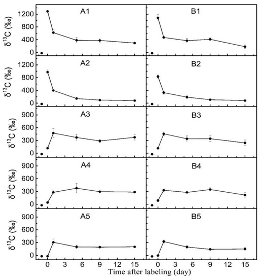 According to Figure 4, at the end of the pulse labeling in the morning, the δ13C in current year leaves, 1-year leaves, branches, stems, and roots were 1287.87‰, 976.26‰, 117.62‰, 39.56‰, and −20.74‰, respectively. Before the pulse labeling, the δ13C in the corresponding organs was −22.09‰, −24.31‰, −21.12‰, −23.74‰, and −21.39‰, respectively. The δ13C in the organs, other than root, was greater than that in the unlabeled plants. The results showed that the photosynthates synthesized during the pulse labeling period in the morning were not transported to the roots. At the end of the pulse labeling in the afternoon, the δ13C in the current year leaves, 1-year leaves, branches, stems, and roots were 1086.03‰, 836.43‰, 115.99‰, 88.84‰, and −4.41‰, respectively, which were greater than those in the unlabeled plant (the δ13C in the corresponding organs was 23.94‰, −26.95‰, −23.49‰, −23.61‰, and −24.81‰, respectively). This indicated that the photosynthates synthesized during the pulse labeling period in the afternoon were transported to the roots. While according to the plant height which sampled at the end of the pulse labeled time in the morning and afternoon, they were 54.97 and 55.10 cm, respectively, it could be inferred that the photosynthates synthesized in the afternoon had a faster transport rate than those synthesized in the morning.