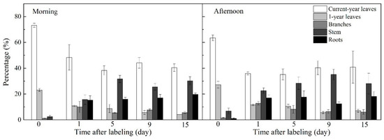 The labeling time had no significant effect on the allocation of the assimilated 13C (except on current year leaves), while the sampling time significantly affected the allocation of the assimilated 13C in the P. massoniana seedlings (Table 2). As shown in Figure 5, the variations in the distribution ratio of the 13C in each organ fixed at different labeling times was the same. At the end of the pulse labeling in the morning and in the afternoon, the ratio of the 13C was 73.26% and 63.48% in the current leaves, 2.57% and 6.88% in the stems, and 0.00% and 0.96% in the roots, respectively. Fifteen days after the pulse labeling, the ratio of 13C in the current year leaves, 1 year leaves, branches, stems, and roots of the plants that were labeled in the morning was 40.41%, 4.16%, 5.55%, 30.20%, and 19.68%, respectively. The ratio of the 13C in the corresponding organs labeled in the afternoon was 40.79%, 6.96%, 6.03%, 28.07%, and 18.15%, respectively, which was similar to those in the morning. This indicated that the allocation of the assimilated 13C synthesized at different times in the plants was different at the initial stages of synthesis but unified with time.