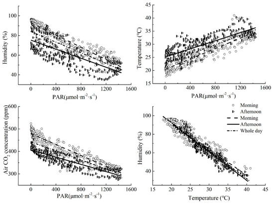 There was a higher capacity for photosynthetic product synthesis in P. massoniana during the morning, when compared to the afternoon on sunny days (Figure 3 and Table 1). Under the same PAR conditions, the temperature in the afternoon was higher than that in the morning, and the humidity in the afternoon was lower than that in the morning (Figure 6), which resulted in a smaller stomatal conductance in the afternoon than in the morning. The stomatal conductance in the afternoon was less than that in the morning [32], which reduced the photosynthetic rate. The activity of the photosynthesis enzymes was related to the temperature [33], and the optimum activation temperature range for RuBisCO is 25–30 °C [34]. In our study, the temperature in the afternoon was more than 35 °C on most days. Therefore, higher temperatures could have inactivated the Rubisco, and decreased the photosynthetic rate by non-stomatal factors [35].