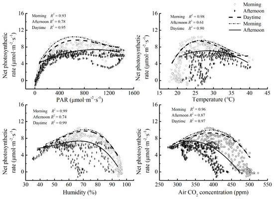 According to the boundary lines of the relationships between the environmental factors and the net photosynthetic rate (Figure 7), photosynthesis in the afternoon was less affected by the environmental factors than that in the morning. This may be related to the difference in the accumulation of the photosynthetic products at the different times [36,37,38]. According to the literature [39,40,41], the higher accumulation of the photosynthetic products in the afternoon would downregulate photosynthesis. Therefore, the decreased ability to synthesize photosynthates in the afternoon when compared to the morning was not only caused by the environmental factors but also by their accumulation.