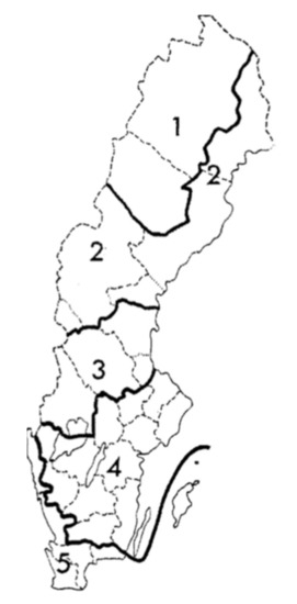 The study area comprises all of Sweden except the southernmost part (temperate region) and follows the regional delineation used in the Swedish NFI (Figure 1). About two-thirds of the area is covered by forests (based on the FAO, Food and Agriculture Organization of the United Nations, forest definition; [18]) with a total area of 28 million hectares [15]. Industrial forestry has occurred on most of the area since the early 1800s, with large-scale implementation of clearcut forestry from the middle of the 1900s [19].