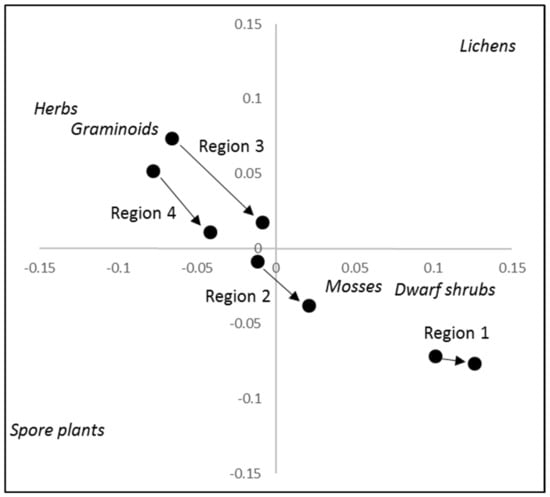 The NMDS ordination of the six groups mirrors the general pattern of significant change in most species groups (Figure 2). The ordination highlights that the composition differs among regions and that it is change over time (both factors significant, p < 0.01). However, only a minor fraction of the total variation in species composition was explained. The ordination suggests that the composition becomes more similar and moves towards the composition in region 1, with a stronger relative dominance of mosses and dwarf shrubs. Additional details on the ordination results are presented in Appendix C.