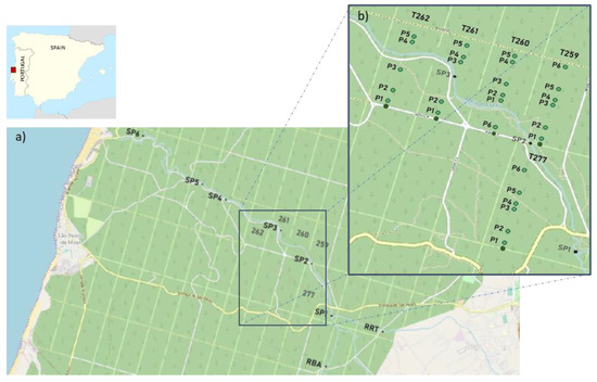 Iberian Peninsula showing Portugal and the location of the Leiria National Forest (red rectangle), (a) study area with sampling locations along São Pedro River (SP1–SP6) and tributaries (Ribeira do Rio Tinto (RRT) and Ribeira do Brejo D’Água (RBA)); (b) the blue rectangle details the location of sampling plots on maritime pine stands. The dark-green circles show the inferior limit of management units (T), and the light-green circles the sampling plots (P). The numbers represent the order in which the surveys were carried out.