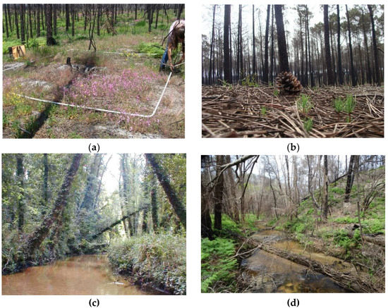 Field campaign of 2018 at Leiria National Forest; (a) sampling plot on maritime pine stands, (b) landscape view 8 months after the fire, (c) sampling plot on São Pedro River location SP4 (‘historical survey’ of 2004), and (d) São Pedro River SP4 (2018; 6 months after fire). Photos (a,b,d) from authors, (c) from A. Albuquerque.