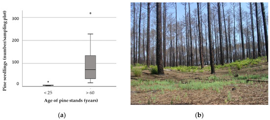 (a) Boxplots for the differences between pine stands with pine ages < 25 years old and pine stands with pine ages > 60 years. (b) Image of the pine seedling on pine stand > 60 y, 8 months after fire.