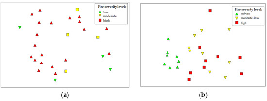 Graphical results of non-metric Multidimensional Scaling procedure (nMDS) using the plant aerial canopy cover of the overall species of (a) pine stands and (b) São Pedro River (riverbanks and channel), 6 months after the fire. Levels of fire severity of the plots were superimposed to the sites.